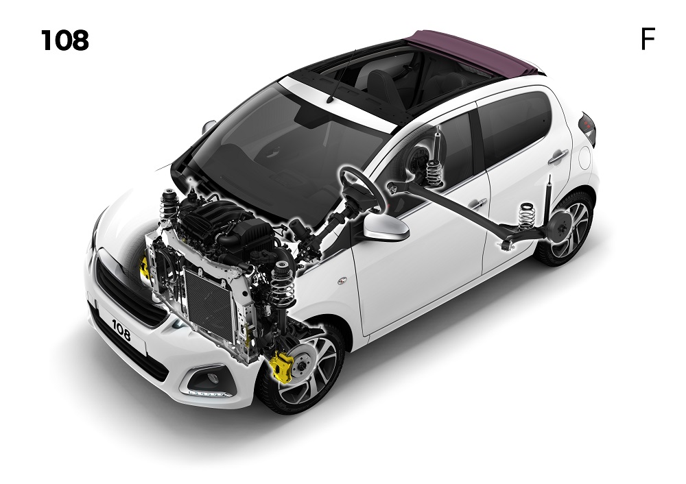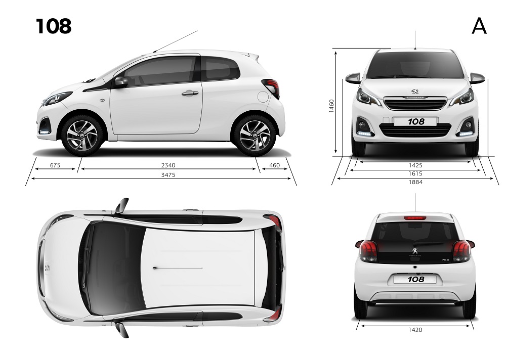 Zákazník si může vytvořit vlastní 108 pomocí sedmi témat osobních úprav a tří verzí interiéru. Témata zahrnují polepy určené na karoserii, vnější zpětná zrcátka, polepy určené do kabiny, koberečky, ovladače otevírání (mechanické, systém „plip“ nebo karta pro bezklíčové odemykání a startování), zatímco tři verze interiéru určují vzhled lišt palubní desky. S délkou 347 cm a šířkou 162 cm je vůz mistrem kompaktnosti. Díky zkráceným převisům a poloměru otáčení 480 cm překonává vůz překážky s obdivuhodnou lehkostí. Při nakládání věcí do zavazadlového prostoru odhaluje vůz jednu ze svých mnoha předností. Karta pro bezklíčové otvírání a startování umožňuje jediným stisknutím tlačítka odemknout dveře a zadní výklopné dveře, které se navíc pootevřou. Zavazadlový prostor je na tuto kategorii velkorysý: 196 l se sadou na opravu pneumatik, 180 l s rezervním kolem. Díky nízkému prahu pouhých 77 cm a 1 m širokému prostoru mezi podběhy kol je nakládání vozu velmi snadné. Počáteční objem 196 l může být zvýšen na 750 l sklopením opěradel zadních sedadel dělených v poměru 50:50.
