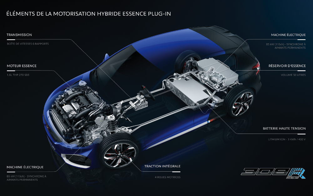 Vývoj byl svěřen týmu Peugeot Sport s cílem vyvinout účinnou zážehovou plug-in hybridní pohonnou jednotku a začlenit ji do platformy EMP2. Peugeot 308 R HYbrid o výkonu 500 k a s pohonem všech 4 kol dosahuje elektronicky omezené rychlosti 250 km/h, zrychlí z 0 na 100 km/h za necelé 4 s a na zrychlení s pevným startem 1000 m mu stačí pouze 22 s. Vůz je dokonale vyvážený, hmotnost je rozložená v poměru 60:40 a nabízí vynikající poměr hmotnost/výkon, sotva 3,1 kg/k.