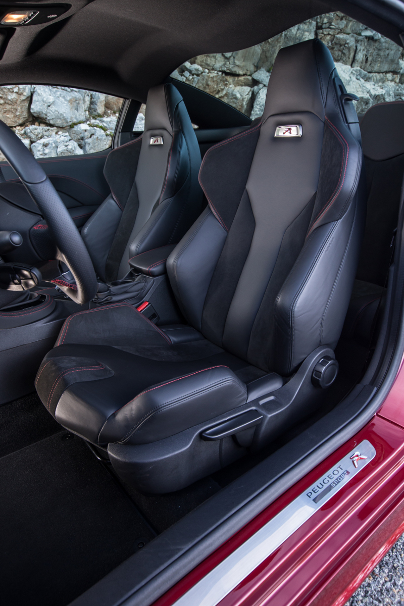Sedadla vysoce sportovního vzhledu jsou potažena plnohodnotnou černou kůží Nappa a materiálem Alcantara. K dokonalým pocitům při řízení přispívá volant malých rozměrů, krátká řadicí páka, specifická hliníková hlavice řadicí páky s červenou lištou a nové obepínající sedadla z dílen týmu Peugeot Sport.