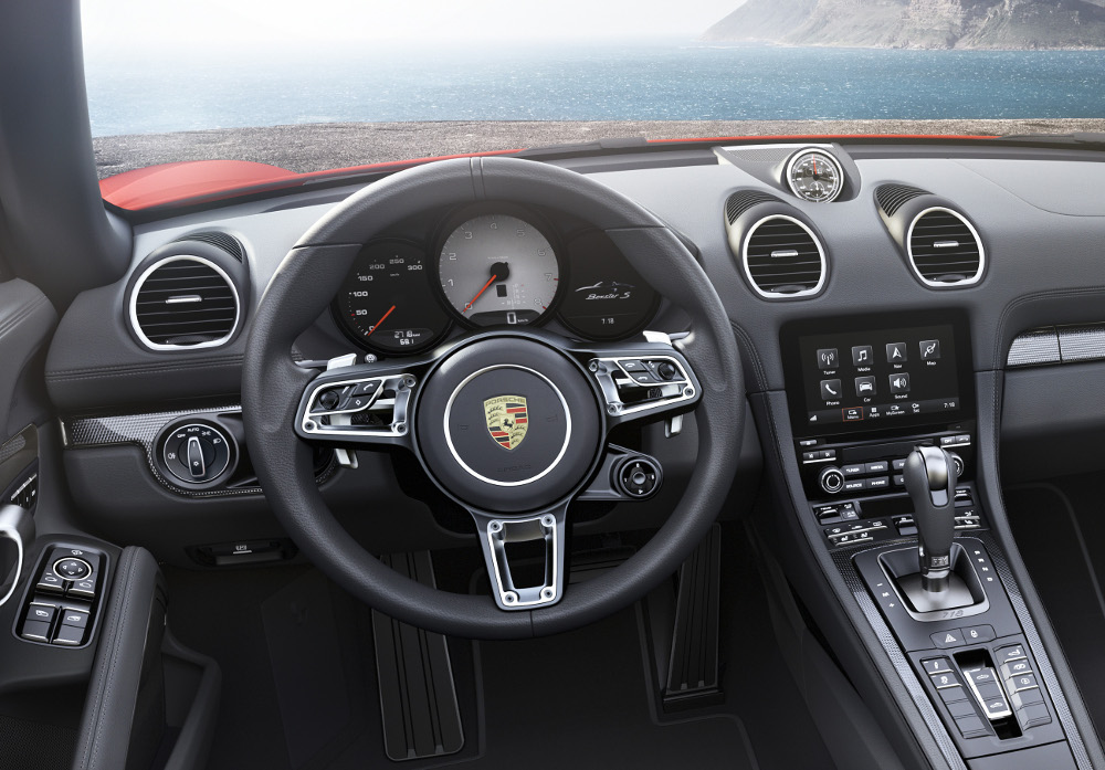V kokpitu 718 Boxster na řidiče čeká známé prostředí s novým přístrojovým panelem nebo jednotkou Porsche Communication Management (PCM) s přípravou na mobilní telefon, audio rozhraním a systémem Sound Package Plus o výkonu 110 W. PCM lze rozšířit pomocí volitelných modulů, které ho dokáží přizpůsobit osobním požadavkům majitele. V nabídce je například navigační systém s hlasovým ovládáním, usnadňujícím zadávání cílových destinací. Kromě toho lze navigační systém vylepšit modulem Connect Plus, který nabízí rozšířené online služby.