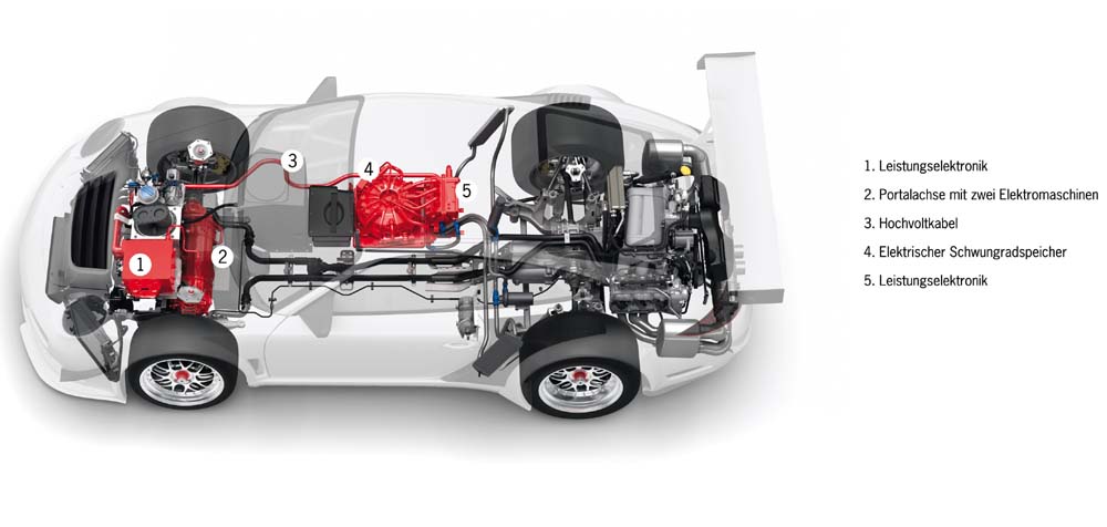 Představená hybridní technologie byla vyvinuta speciálně pro použití v závodním automobilu a svojí koncepcí i uspořádáním se liší od současných konvenčních hybridních ústrojí. Každé z předních kol závodního speciálu 911 GT3 R Hybrid pohání elektromotor s výkonem 60 kW. Celek doplňuje čtyřlitrový plochý šestiválec boxer s výkonem 480 k, umístěný v zádi a pohánějící kola zadní nápravy. Významnou inovací je použití setrvačníku vyrábějícího elektřinu místo konvenčních akumulátorů. Setrvačníkový generátor je umístěn vedle řidiče a je zdrojem elektřiny pro dvojici elektromotorů.