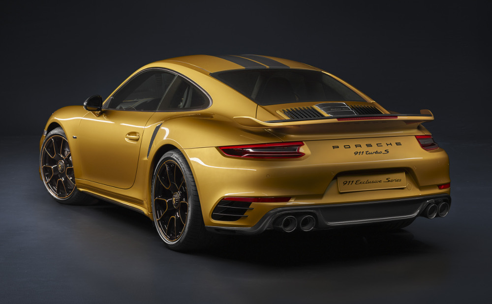 Porsche 911 Turbo S Exclusive Series je nezaměnitelným vozem díky mnoha dílům z uhlíkového kompozitu a exkluzivnímu metalickému laku ve zlatožlutém odstínu. Z kompozitu, vyztuženého uhlíkovými vlákny, jsou vyrobeny například přední kapota, střecha a boční prahy. Sportovní vzhled umocňují navíc dva pruhy z viditelného uhlíkového kompozitu na střeše a přední kapotě. Záď se vyznačuje zadním spoilerem ze sady aerodynamických prvků „Aerokit-Turbo“, novým spodním dílem nárazníku, systémem Ram Air z uhlíkového kompozitu pro zvyšování tlaku vzduchu, přiváděného do motoru, a výfukovou soustavou se čtyřmi větvemi a dvěma dvojitými koncovkami z ušlechtilé oceli v černé barvě. Blatníky zdobí plakety manufaktury Porsche Exclusive. Kromě zlatožlutého metalického laku je vozidlo nabízeno v dalších vybraných barvách karoserie.