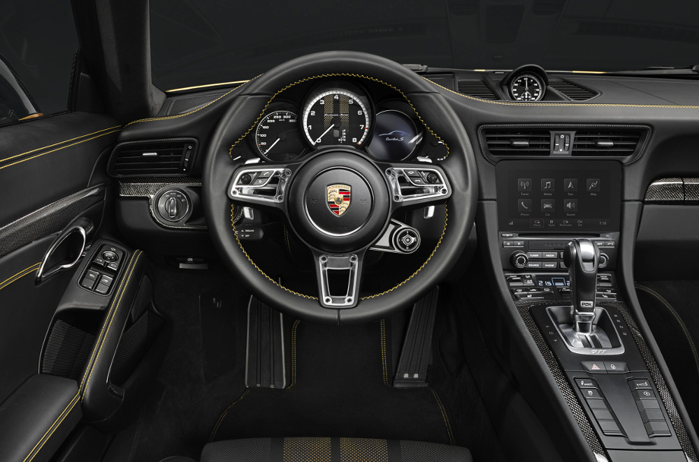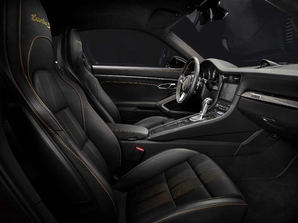 Sportovní sedadla, nastavitelná v 18 směrech, jsou čalouněna perforovanou kůží. Vnitřní plochu čalounění doplňují dva pruhy ve zlatožlutém odstínu, což zaručuje jedinečný efekt. S nimi ladí kontrastující prošívání a vyšívaný nápis Turbo S na opěrkách hlavy ve zlatožlutém odstínu. Strop je čalouněn Alcantarou a opatřen ozdobnými zlatožlutými dvojitými pruhy. Do ozdobných lišt interiérového paketu Carbon jsou vložena jemná zlatožlutá kovová vlákna..