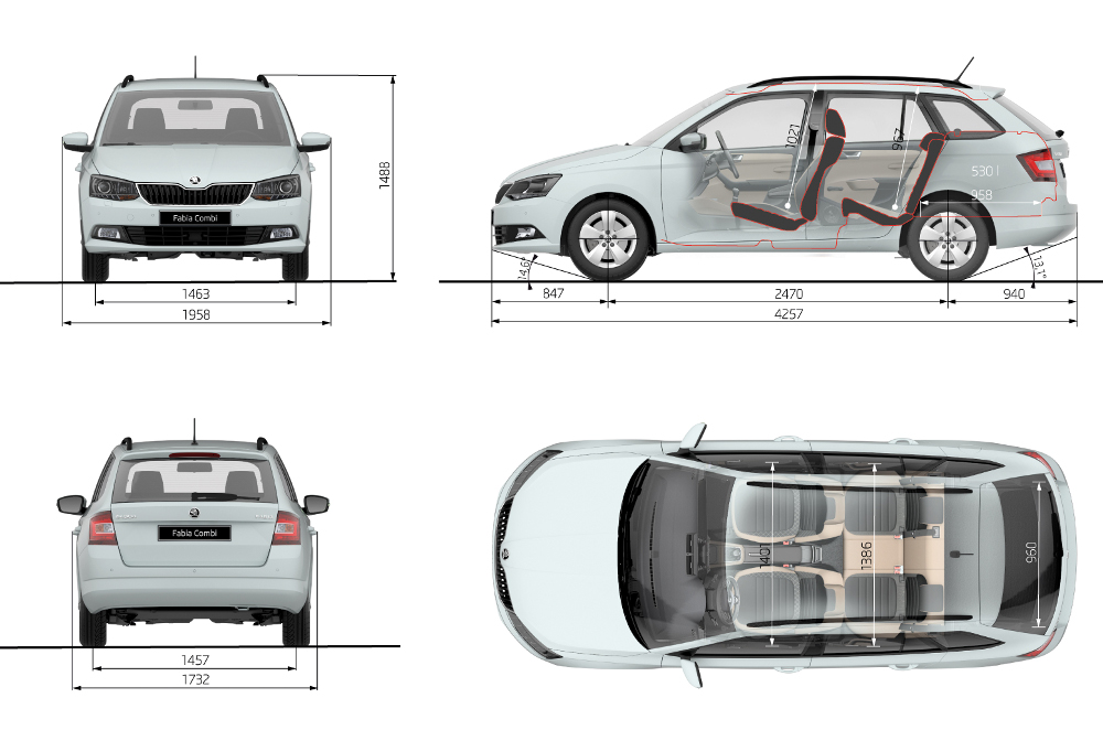 Nová ŠKODA Fabia Combi je o 10 mm delší, 90 mm širší a 31 mm nižší než druhá generace. Novince v neposlední řadě prospělo také mezigenerační rozšíření předního rozchodu o 30 mm (zadního o 31 mm), spolu s prodloužením rozvoru o 5 mm.