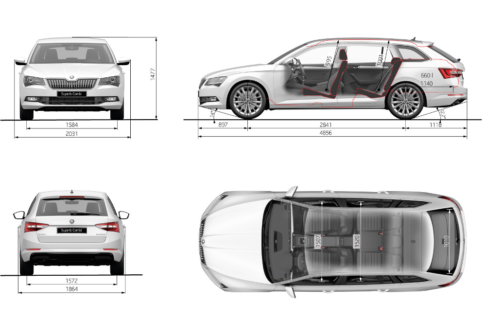 Škoda Superb Combi má s liftbackem shodný rozvor náprav 2841 mm i rozchod kol 1584 mm/1572 mm. Na výšku se zvětšil o 9 mm a na délku o 6 mm, tedy o zanedbatelné hodnoty.