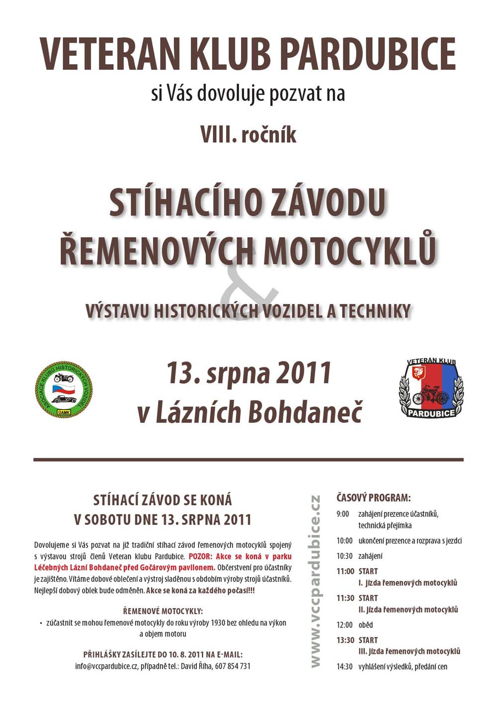 V sobotu 13. srpna se v Lázní Bohdaneč uskuteční již osmý ročník Stíhacího závodu řemenových motocyklů do roku výroby 1925. Snahou pardubického veteran klubu je přiblížit zájemcům z řad laické veřejnosti nejstarší období motorismu.