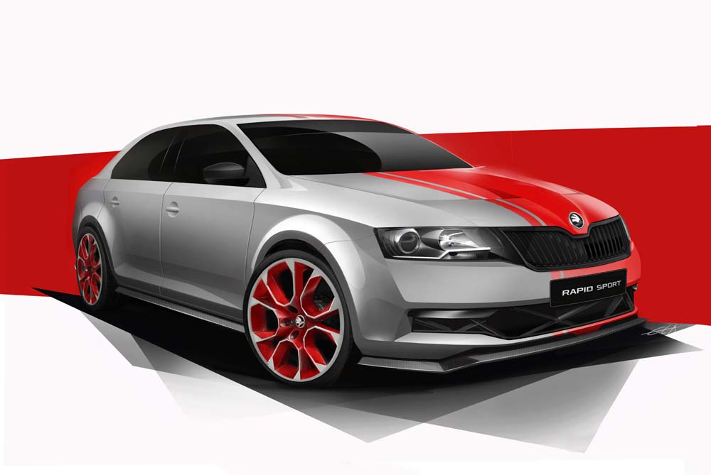 ŠKODA Rapid SPORT ukazuje potenciál designu Škoda a možnosti, které se skrývají v Rapidu. Vznikl vůz plný dynamiky se sportovním vzhledem. Vůz je nalakován v metalických barvách červená Corrida a šedá Steel. Sebevědomě a osobitě stojí tento sportovní vůz na velkých 19“ kolech z lehké slitiny. Předek vozu okouzlí spoilerem a mohutným otvorem pro přívod vzduchu. Velkoryse dimenzované blatníky a masivní prahy podtrhují vnější vzhled vozu.