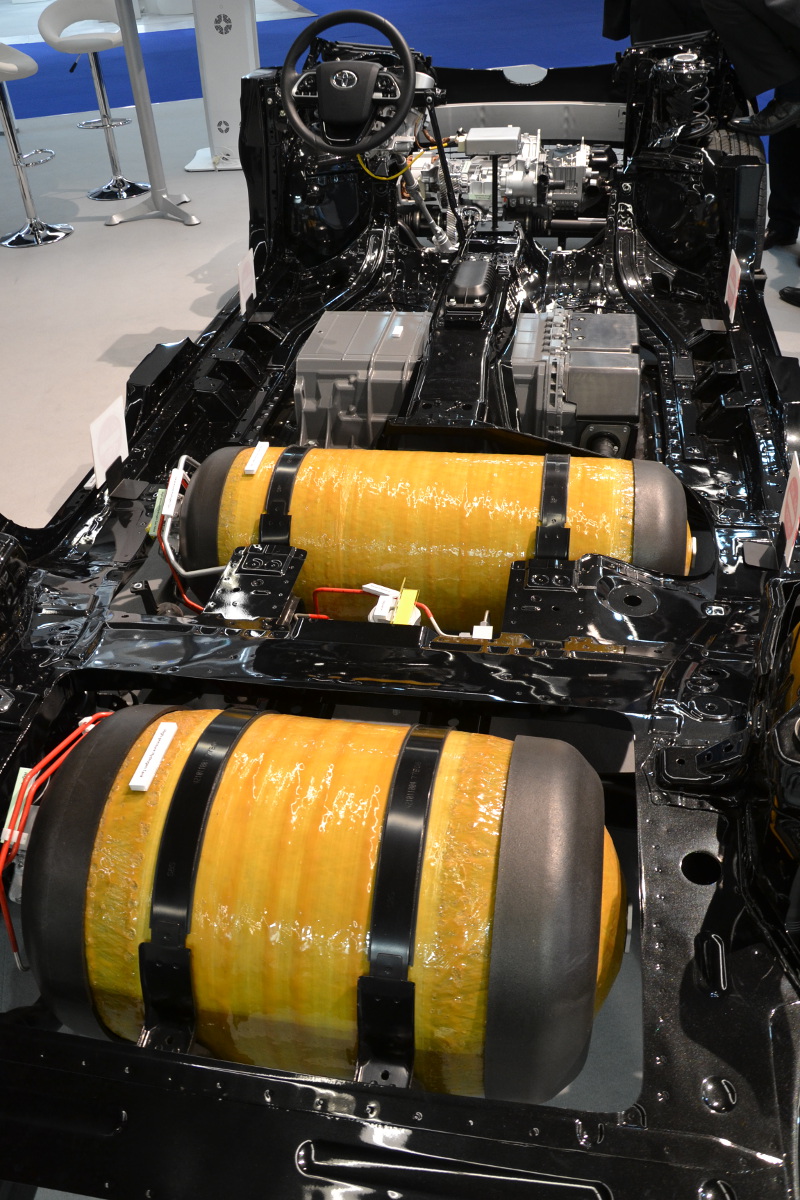 K ukládání vodíku za vysokého tlaku 70 MPa (cca. 700 barů) slouží zásobníky složené ze tří vrstev, vyrobené z plastu vyztuženého uhlíkovými vlákny a dalších materiálů. V porovnání s vysokotlakými zásobníky u modelu Toyota FCHV-adv se úložná kapacita zásobníku zvedla přibližně o 20 procent, avšak při současném snížení hmotnosti i rozměrů.