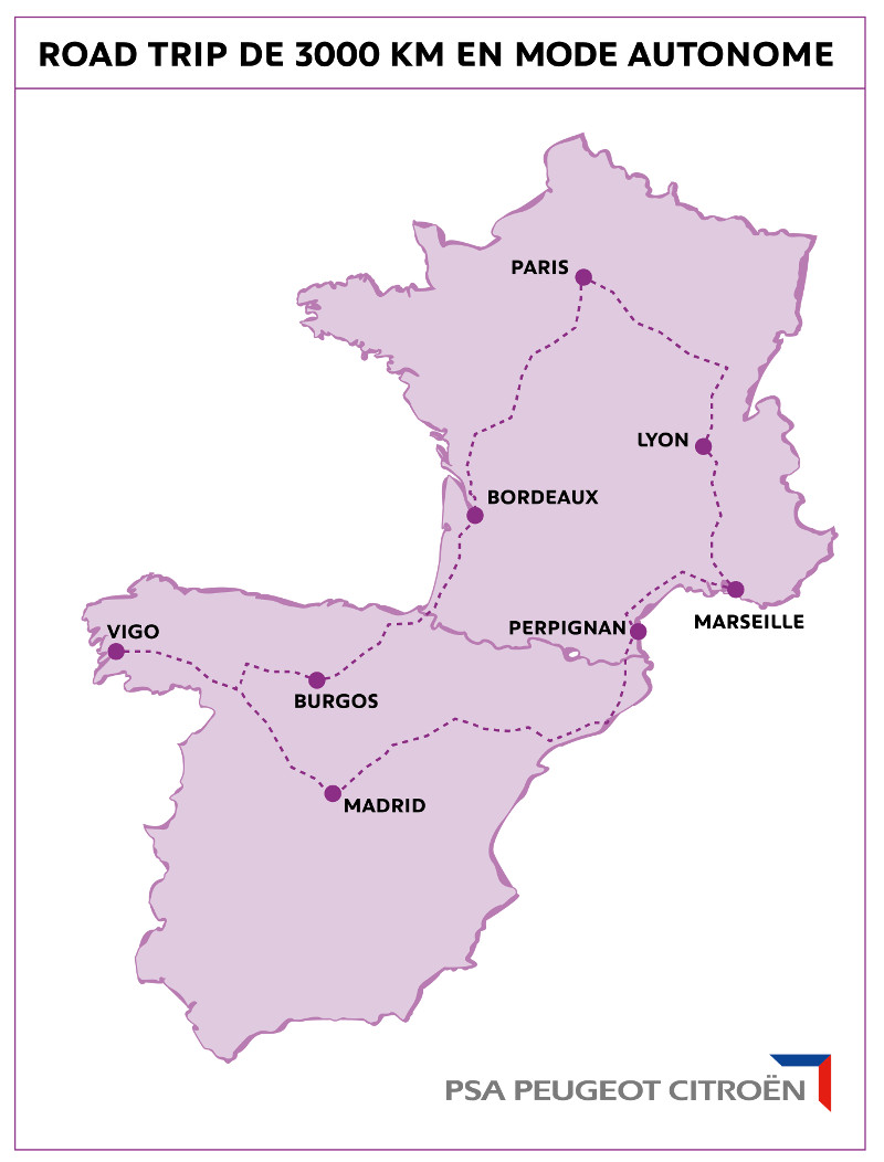 Prototyp PSA Peugeot Citroën má za sebou nejen premiérovou jízdu ve Francii na trase z Paříže do Bordeaux, ale už také absolvoval cestu dlouhou přibližně tři btisíce kilometrů z Paříže přes Vigo do Madridu. Na zpáteční cestě projel města Perpignan, Marseille a Lyon a zamířil do technického centra skupiny ve Vélizy v pařížském regionu.