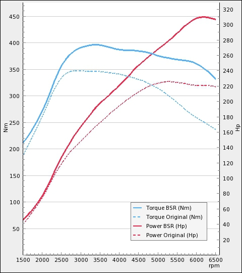 Naše měření ukazují, že optimalizace BSR Stage1 IC přináší skutečný nárůst 83 k a 48 Nm a výsledné parametry výkonu činí 308 k a 395 Nm. Elektronický omezovač maximální rychlosti Vmax je posunut na 275 km/h a pružné zrychlení na 3. rychlostní stupeň mezi 80 – 120 km/h činí pouhých 2,7 s.