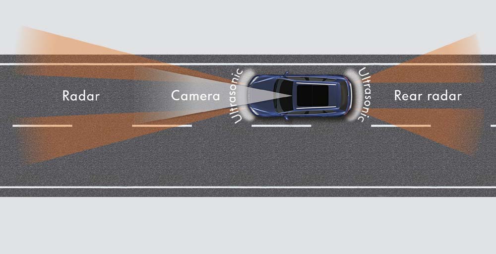 Adaptivní tempomat ACC samočinně udržuje bezpečný odstup od vpředu jedoucího vozidla. Automaticky zrychluje, ale i brzdí, v případě potřeby až do úplného zastavení. Prostor před vozidlem přitom sledují dva radarové senzory, jejichž paprsky s úhlem rozevření 40° mají dosah 200 metrů.