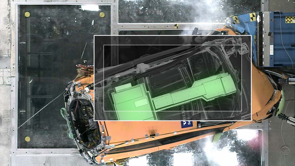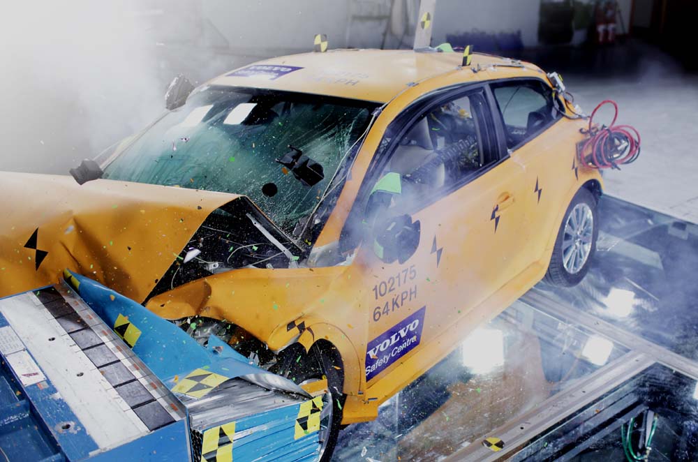 Vůz měl při testování v nárazové laboratoři Volvo plně nabitou baterii a jednalo se o tzv. předsazený náraz, kdy 40 procent šířky přídě narazilo v rychlosti 64 km/h do bariéry.