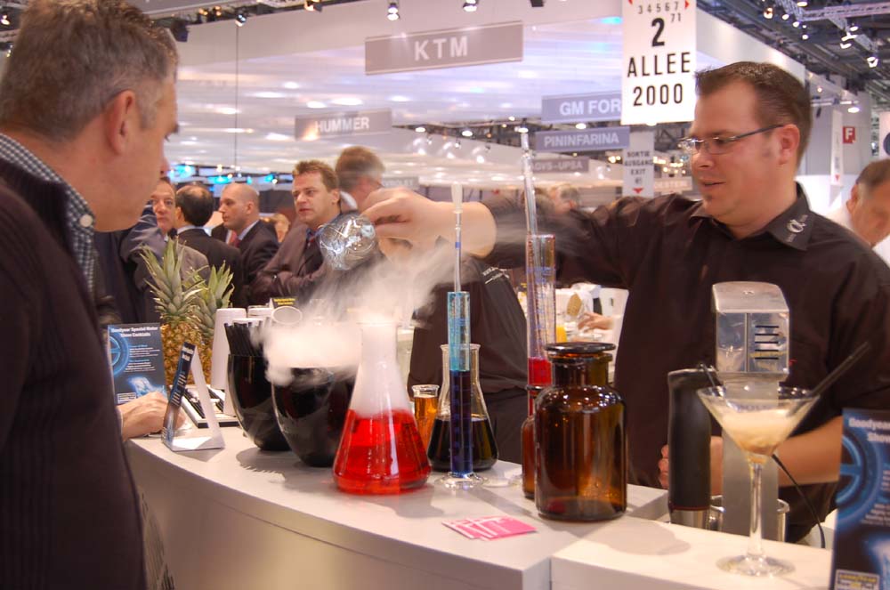 Pokud si máte všechno prohlédnout a pořídit fotografie, máte dva dny co dělat. Jak známo při práci vyhladne a vyprahne, ale i na to vystavovatelé pamatují, a na svých stáncích poskytují po celý den občerstvení. Na snídani si skočíte třeba k Opelu, v poledne na bavorskou klobásku k Audi, na pivo ke škodovce nebo k BMW, na dobrou kávu k Alfě Romeo nebo Maserati. Víc toho ani nestihnete. Na jednom stánku to vypadalo jako v chemické laboratoři, kde se však neprováděly pokusy, ale míchaly jakési nápoje. Raději jsme s díky odmítli.