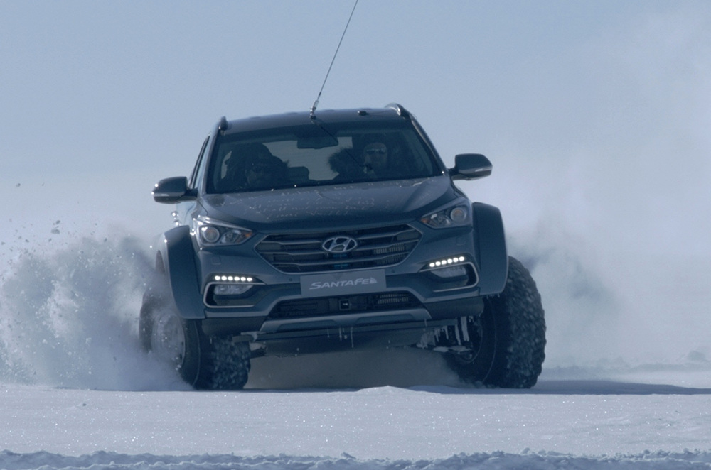 Hyundai Santa Fe, který byl pro potřeby expedice uzpůsoben tak, aby na něj pasovaly větší nízkotlaké pneumatiky, absolvoval téměř 5 800 kilometrů v zledovatělém terénu. To vše v extrémních klimatických podmínkách při teplotách až minus 28 stupňů Celsia v místech, kde doposud žádný automobil neprojel.