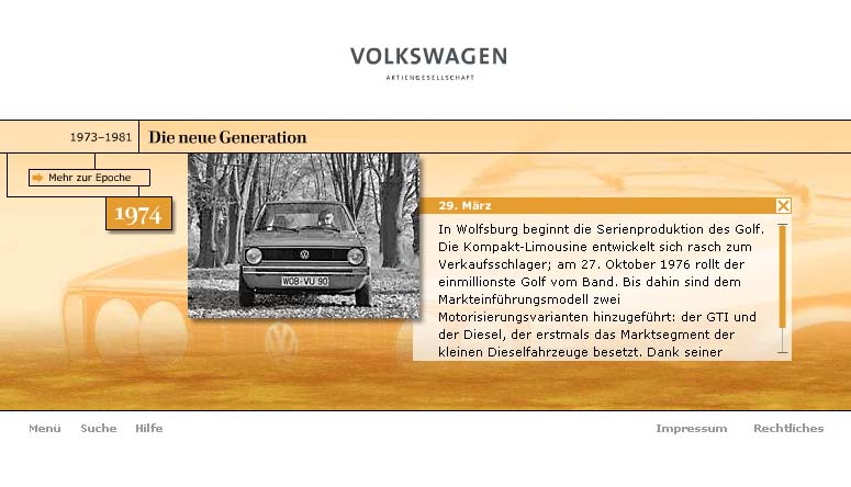 Volkswagen AG spustil v těchto dnech uživatelsky přívětivý internetový archiv o 70 letech své existence. Všichni zájemci o tuto historii tak mají online přístup do vyčerpávajících chronologicky seřazených záznamů na internetové stránce http://www.chronik.volkswagenag.com/.