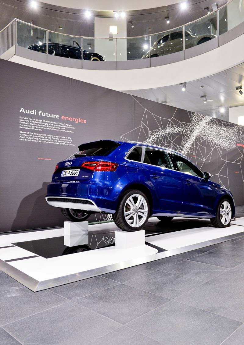Na cestě k trvale udržitelné mobilitě budoucnosti klade Audi velký důraz na vývoj nových nosičů energie, s nimiž se mohou návštěvníci výstavy seznámit v sekci „Audi future energies“ (energie budoucnosti podle Audi). Společně se specializovanými partnery pracuje Audi na projektu Audi e-gas. Zároveň připravuje k uvedení na trh nová paliva na biologickém základě, která nesou označení Audi e-ethanol a Audi e-diesel. V obou případech se jedná o paliva, jejichž spalování je z hlediska emisí CO2 neutrální.