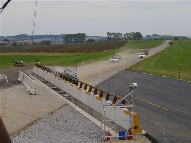 „Abychom mohli zkoušku uskutečnit, bylo nutné vybudovat mostní římsu, na kterou jsme svodidlo ukotvili. Samotná zkouška proběhla tak, že do svodidla nejprve narazilo rychlostí 100 km/h osobní vozidlo pod úhlem nájezdu 20 stupňů. Po něm následoval náraz nákladního vozu. rychlostí 80 km/h pod stejným úhlem. Automobily pro tuto zkoušku speciálně upravila a vybavila dálkovým řízením společnost TAZUS Praha. Zkouška kotveného svodidla proběhla úspěšně, ani naměřené hodnoty snímané v narážejících vozidlech nepřekročily mezní hodnoty pro ochranu přepravovaných osob,“ uvedl koordinátor projektu Jaroslav Doubrava ze společnosti Skanska Prefa.