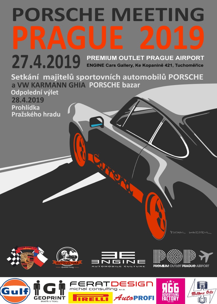 Již po čtvrté se v sobotu 27. dubna 2019, sjedou sportovní automobily Porsche v areálu obchodního centra Premium Outlet Prague Airport, na tradičním jarním pražském setkání, kdy součástí je i návštěva místní Engine Cars Gallery, beseda se zajímavými lidmi a odpolední výlet.