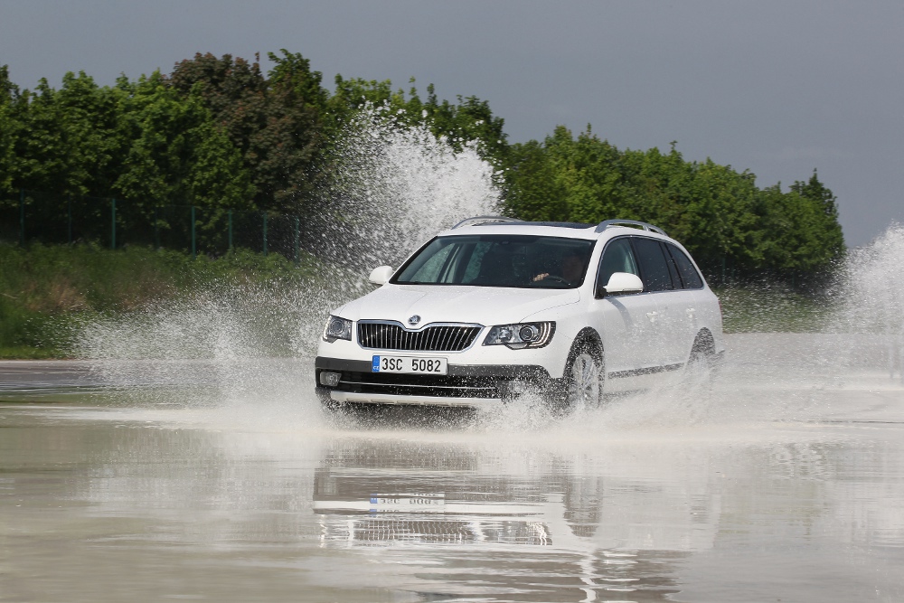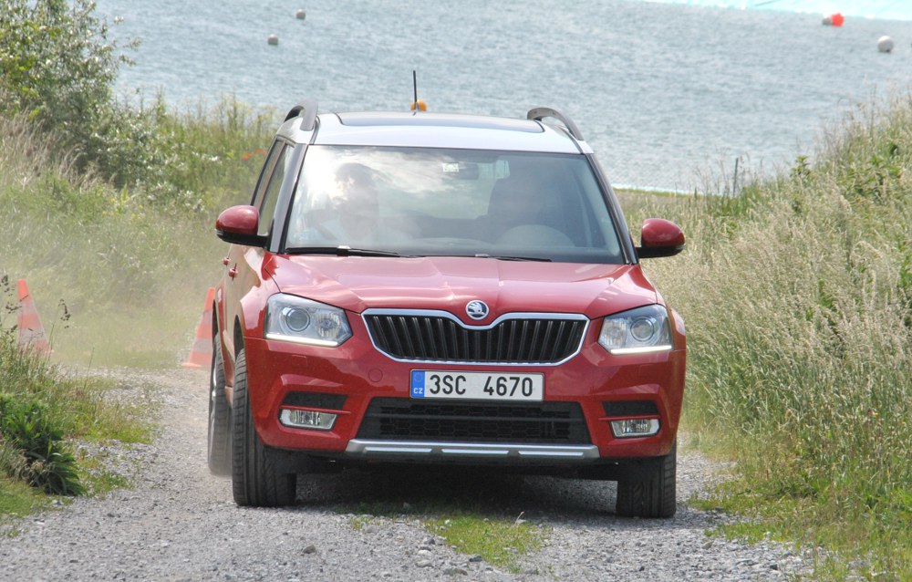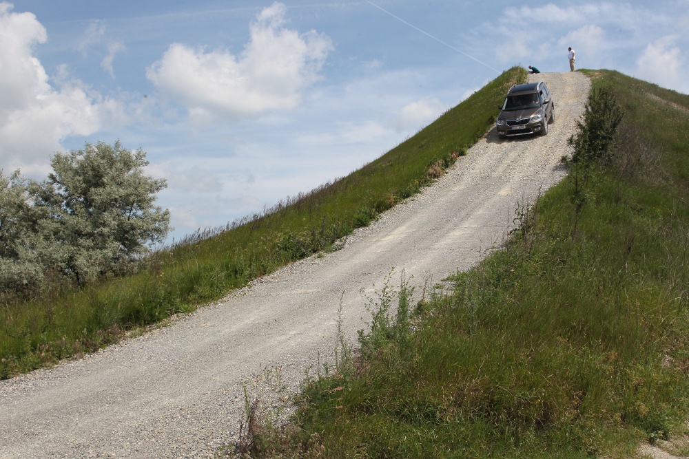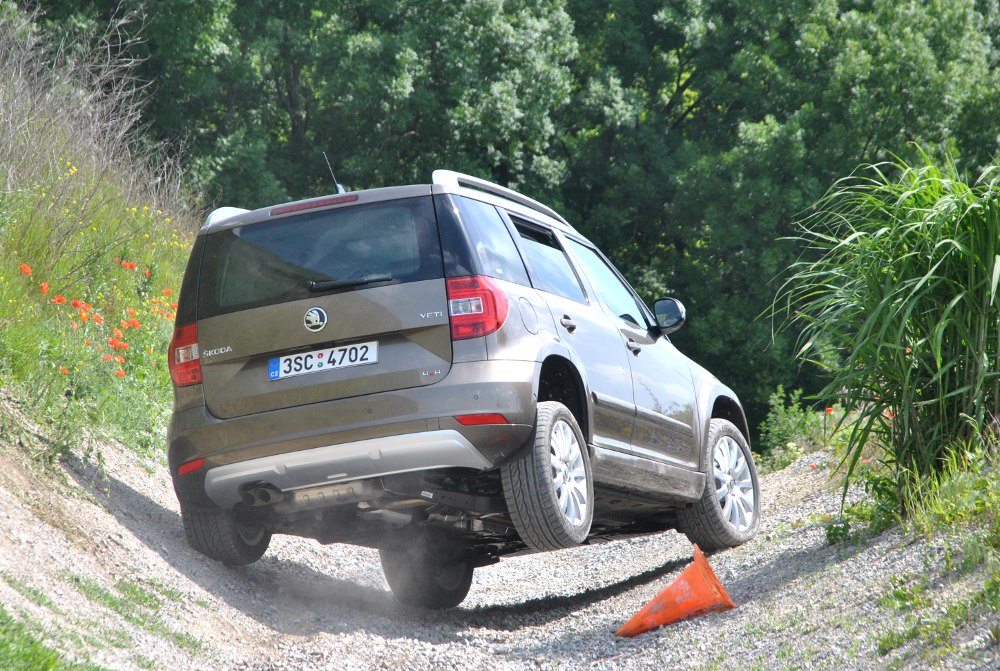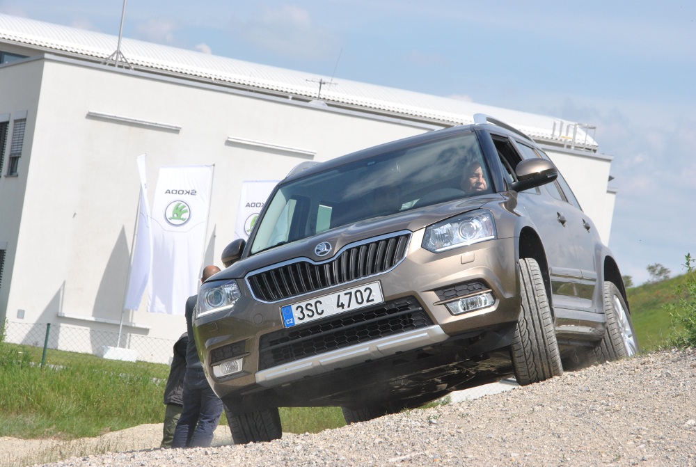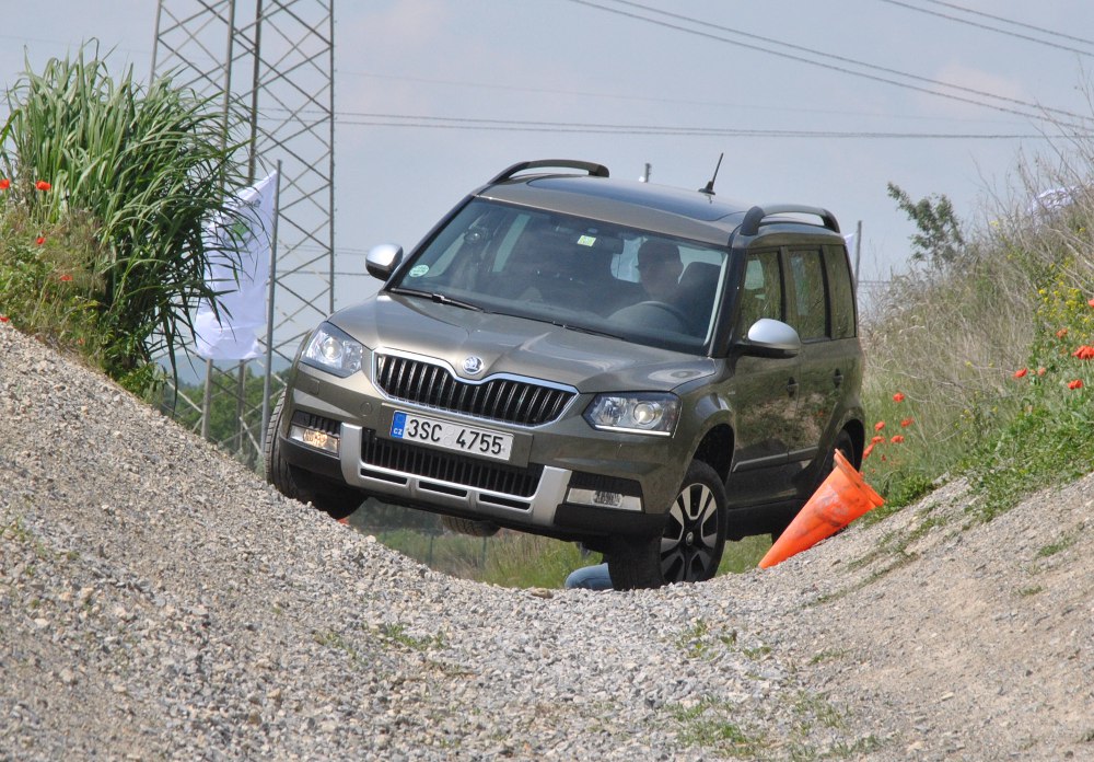 Akce, určená nejen pro české novináře, ale i zahraniční, probíhala pod vedením zkušených instruktorů, včetně bývalých soutěžních jezdců. Nejdříve jsme okusili jízdu po terénní dráze se Škodou Yeti a vyzkoušeli jsme věci, na které bychom se asi jen těžko sami odvážili. Pud sebezáchovy by byl silnější. Jen si zkuste sjíždět nejdříve šedesáti procentní a poté osmdesátiprocentní svah bez brzdění. Stačí se jen rozjet a pustit brzdu, pochopitelně se zařazeným režimem offroad. Kopec sjedete v absolutním klidu, protože elektronika přibrzďuje jednotlivá kola a nedovolí, aby se vůz překročil plíživou rychlost. Yeti obstál na jedničku. V době našich testů bylo sucho, ale na blátě už to bude asi horší. Výborně se vyrovnal také s bočním náklonem nebo při křížení náprav.