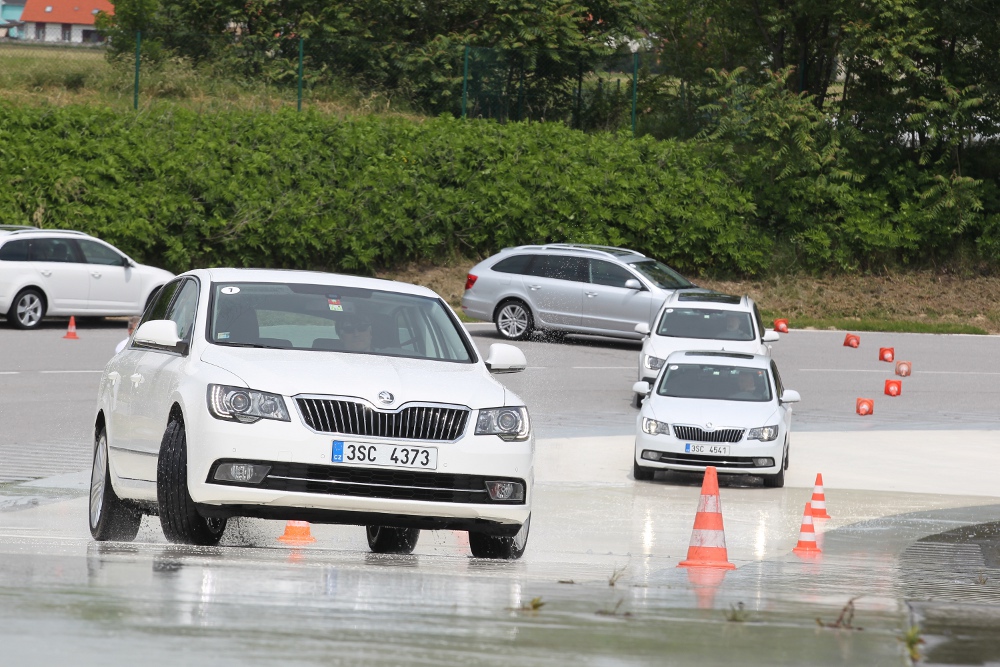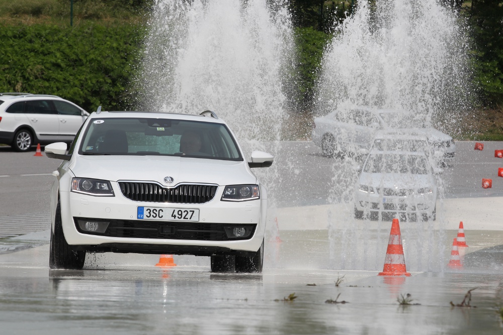 Odpoledne jsme mohli na kluzných plochách porovnávat vlastnosti Octavií a Superbů s pohonem předních kol a pohonem všech kol. Neustálým přesedáním z jednoho vozu do druhého s odlišným nastavením získal člověk dokonalý přehled, jak se vůz chová v zatáčkách na mokru. Takovou instruktáž bychom přáli každému řidiči, aby se sám mohl přesvědčit, co jej může překvapit.