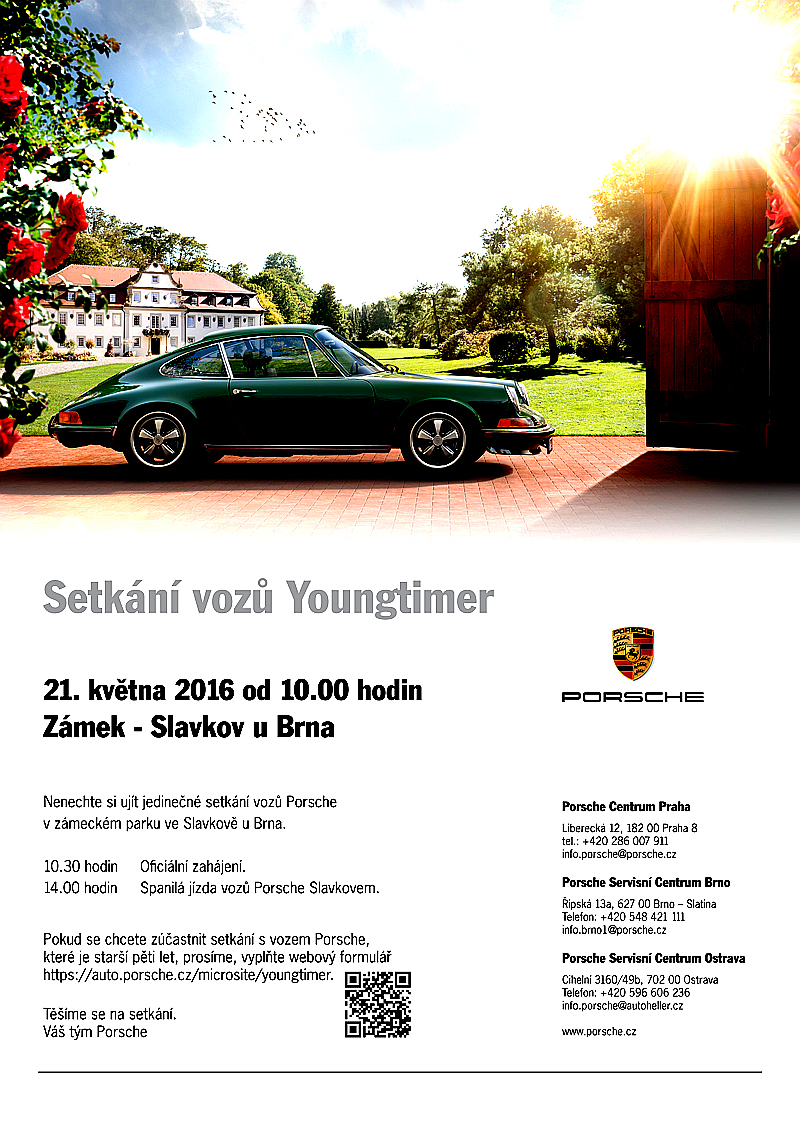 Na první ročník setkání Youngtimer na Zámku Slavkov u Brna se registrujte prostřednictvím on-line formuláře na: https://auto.porsche.cz/microsite/youngtimer/.
