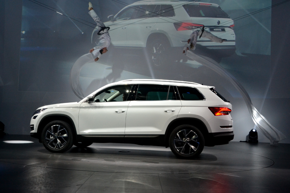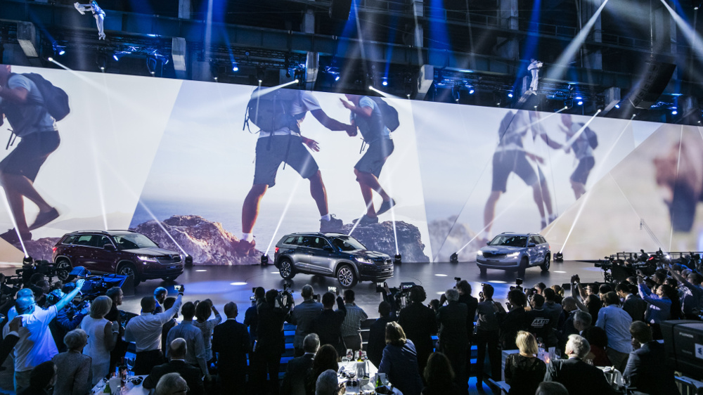 Čtyři vozy ŠKODA KODIAQ dobyly pódium a skvěle se začlenily do příběhů vyprávěných prostřednictvím světelných projekcí. Emocionálně navržené vozy přitom projely ,kaleidoskop života‘ se čtyřmi tematickými oblastmi, které tvoří rozpětí nového velkého SUV značky ŠKODA: Urban, Outdoor, Sport a Utility. O další dynamiku se postaraly výlučně za tímto účelem instalované rampy s úhlem stoupání 19,5 stupně – model ŠKODA KODIAQ tak zde symbolicky naznačil své vyhraněné terénní vlastnosti.