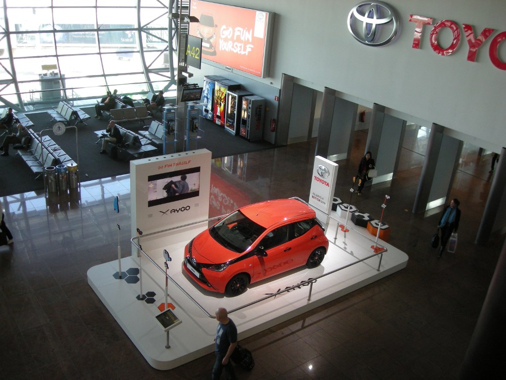 S novou Toyotou AYGO se nyní mohou podrobně seznámit cestující procházející terminálem „A“ bruselského letiště. Vystavovaným vozem je AYGO v barevném provedení Pop Orange, dekory v černém klavírním laku a 15" litými koly se zdvojenými paprsky v leskle černém tónu.
