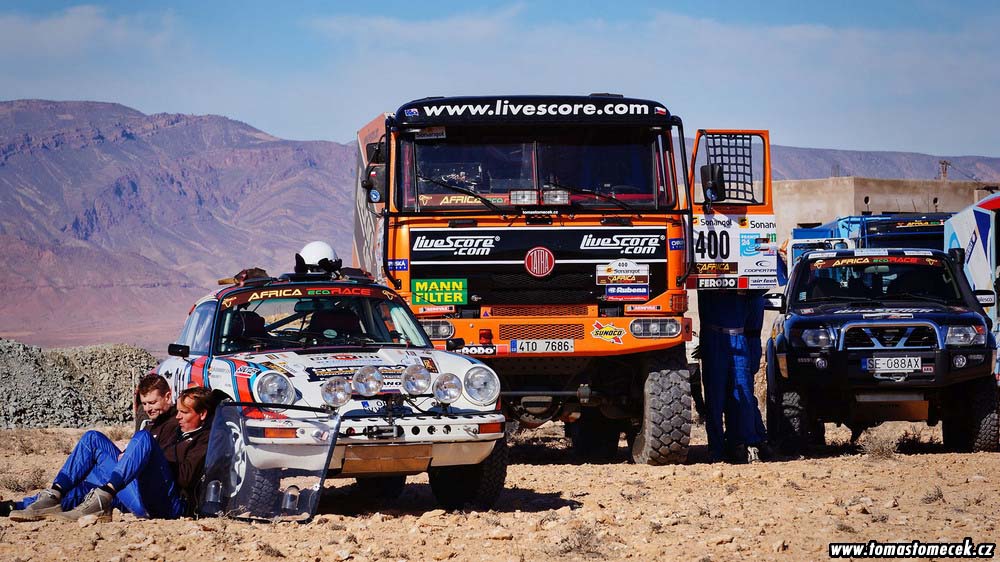 Ale popořádku. Dokumentovali jsme start do etapy a chtěli stihnout cíl. Start byl umístěn na typicky marocké kamenité pláni. Prachová stopa zdvihnutá dříve startujícími speciály ukazovala cestu do nedalekých hor. Chtěli jsme stihnout být ještě na konci etapy. Nevyšlo nám to. Možná asi tak lépe. Vidět prázdný bivak hned první den závodu, to se nestává každý rok. Hlavním důvodem rozhodnutí nejet k cíli závodu byla dlouhá cesta po asfaltových cestách. Více než pět set kilometrů nás zdrželo déle, než jsme předpokládali a mysleli jsme, že to už nemůžeme stihnout. Úplně jsme zapomněli, jak vypadají marocké silnice ve vnitrozemí. Většinou je vyasfaltován jen jeden pruh a silnice je prohlášena za dvoupruhou. Pokud se potkají dvě auta, tak se rychle gestikuluje a pak se rozhodne, kdo najede na šotolinovou krajnici. Ze začátku to vnímáte jako veselé příběhy z cestování, ale po tří stech kilometrech takovéhoto cestování to trošku kazí náladu.
