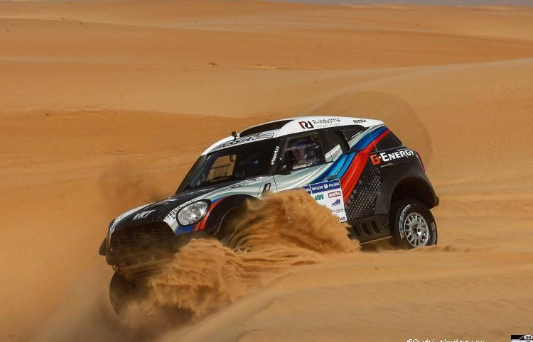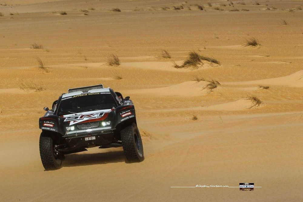 Právě na kamení doplatila Tomečkova Tatra. Její pilot v něm na zhruba 50. kilometru prorazil pravou přední pneumatiku, a aby toho nebylo málo, ještě utrhl i trubku dohušťování. “Přitom právě práce s tlaky v pneumatikách byla dnes alfou a omegou úspěchu,” je přesvědčen Tomeček. “Trať vedla přes spoustu hodně měkkých dun a zrádných písků. Také to bylo samozřejmě o spojce,” dodává český jezdec.