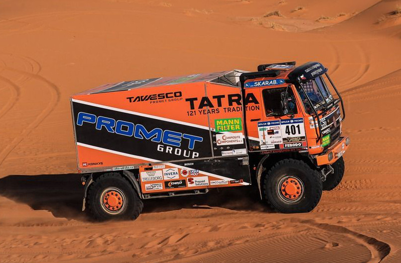 Dodejme, že první defekt už potkal i Tomečkovu Tatru. Naštěstí se levé zadní kolo dařilo dohušťovat až do cíle, a nevznikla prakticky žádná časová ztráta. Podobný problém měl i De Rooy. Tomečkovo kolo nyní poputuje na sběrný kamion balai, opraví se a zase použije. Pokud se tedy balai ukáží. Poslední noc do bivaku nedorazilo ani jedno. Baléčka pilotovaná Petrem Foltýnem a Leopoldem Paďourem měla totiž hromadu práce v dunách, kde na ně čekala spousta nepojízdných klientů. Aby toho nebylo málo, tak na Foltýnově voze odešel startér, a tak jej posádka Tomečkovy asistence musela ráno měnit. Nebylo pak divu, že když týmový šéf dorazil dnes po etapě do bivaku, musel na příjezd asistence ještě chvíli počkat.