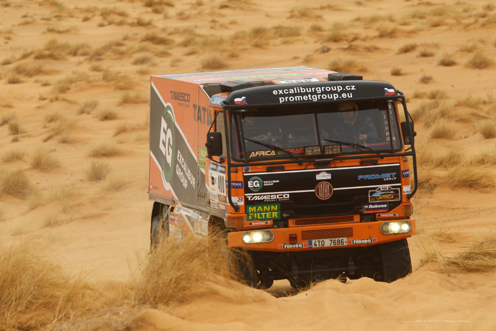 Iritrack ukazoval, že Tatra stojí okolo sedmdesátého kilometru, nicméně již neprozrazoval proč. Se dvěma odlepenými pneumatikami na pravé straně, hluboko zabořená v měkkém písku a nakloněná na pravou stranu...“Až budu mít firmu na přesýpací hodiny, tak budu používat písek z tohoto místa,“ pokračuje s trpkým úsměvem na tváři unavený Tomečkův navigátor. „Tomáš se snažil zvednout auto a já jsem podkopával pravé přední kolo. Postupně jsme odházeli snad dvě Tatry písku. Nakonec se dobrá věc podařila a pravé kolo mělo tlak."