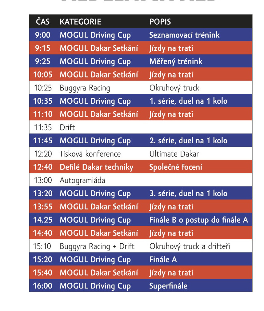 Program MOGUL Dakar Setkání začíná v neděli 26. března v 9:00 a finále je připraveno na 16:30. Nenechte si ujít tuto jedinečnou šanci vidět takové množství závodníků z Dakaru a Africa ECO Race na jednom místě, a hlavně jejich úžasnou techniku v pohybu na atraktivní trati. Vidět létat vzduchem desetitunový kamion, to stojí za to!