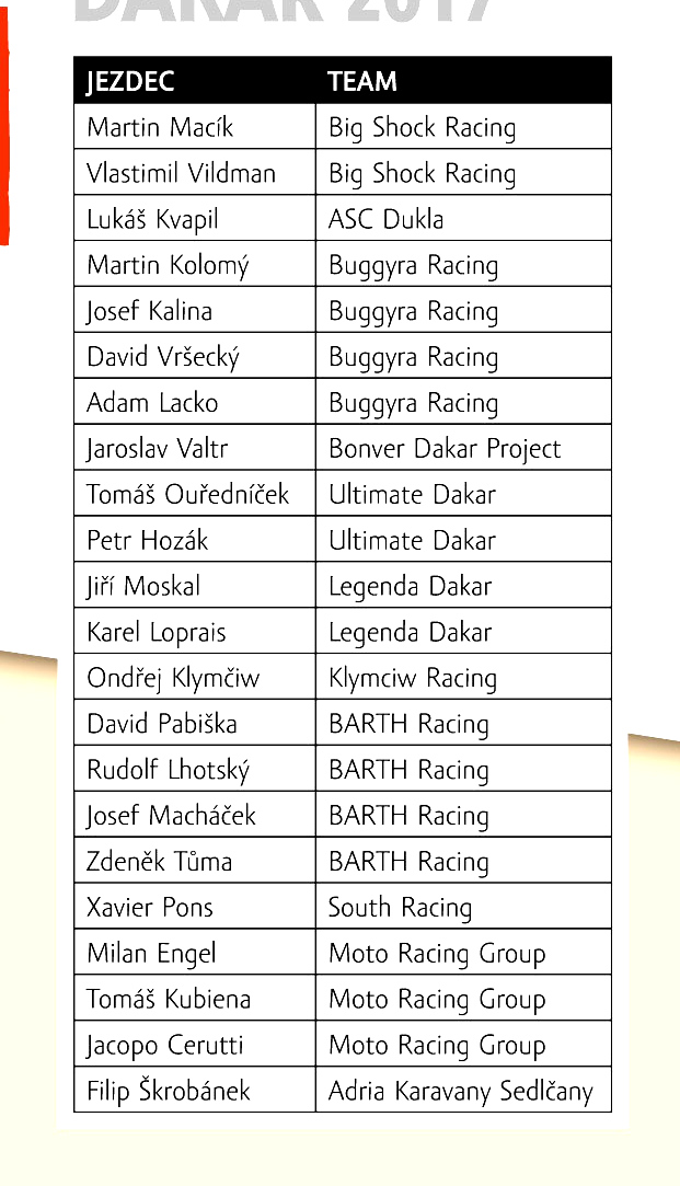 Diváci uvidí silné české týmy, jako jsou Buggyra Racing, Big Shock Racing, BARTH Racing, Bonver Dakar Project, South Racing, MRG Racing. Chybět nebudou motocyklisté Ondřej Klymčiw, Lukáš Kvapil a další. Moderní závodní speciály se divákům představí na atraktivní trati, kde nechybí množství skoků, a budou střídány historickými dakarskými kamiony Tatra a LIAZ a doprovodnou technikou.