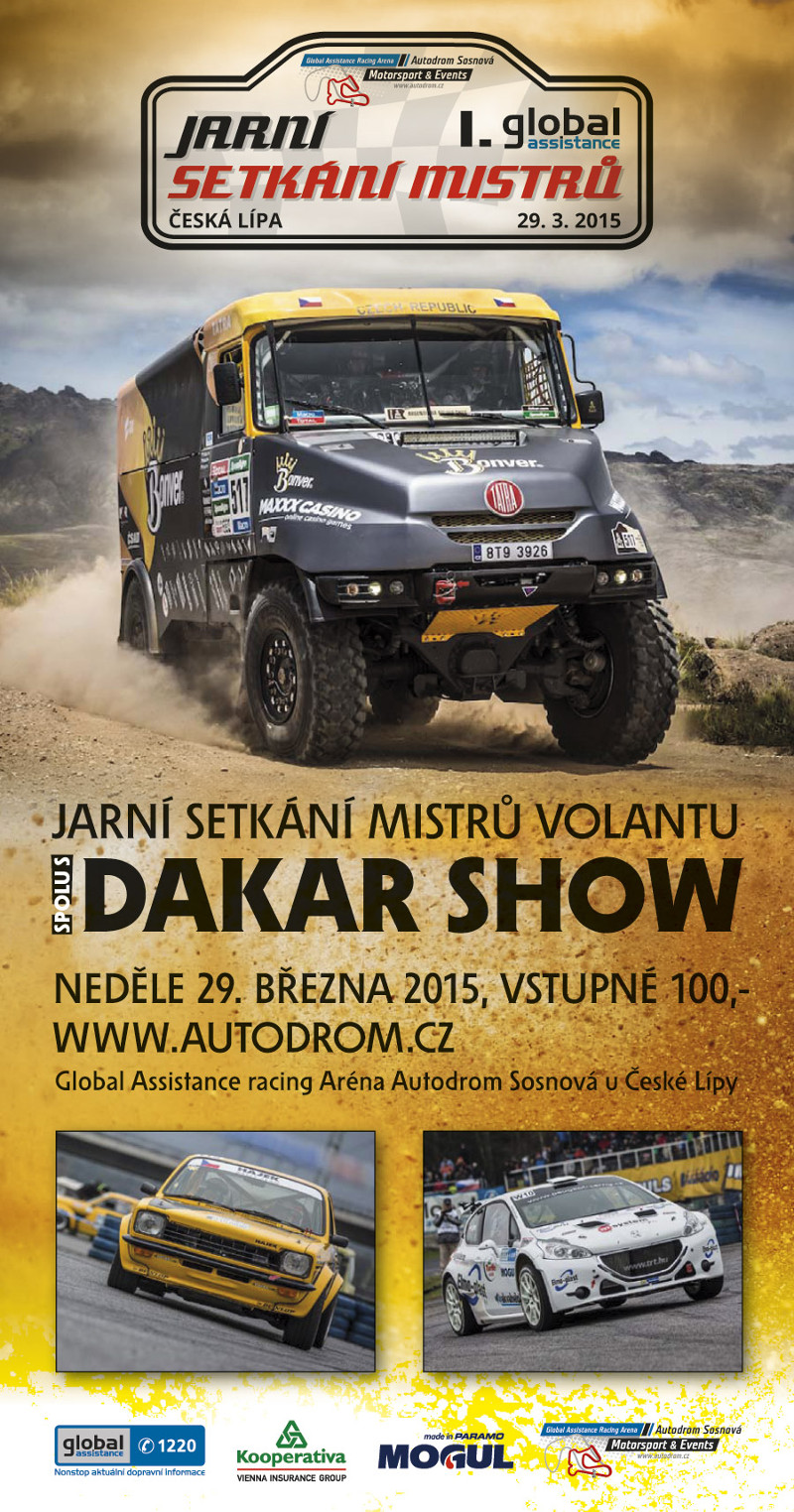 Zlatým hřebem programu bude DAKAR show při níž se divákům představí závodní automobily českých závodníků z Rallye Dakar v depu, ale i při jízdě na trati, kde je speciálně pro tuto akci vybudován i nový a velký skok na šotolině. Divákům se předvedou i okruhové a vrchařské automobily včetně tisícikoňového trucku Buggyra Big Boy, který se utká s Opelem ADAM cup. Spojujícím prvkem Global Assistance Setkání mistrů volantu 29. března v Sosnové bude závod amatérských soutěžních jezdců, kteří se utkají v soubojích muže proti muži na trati autodromu.