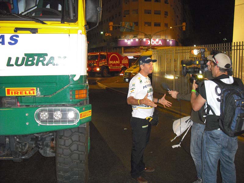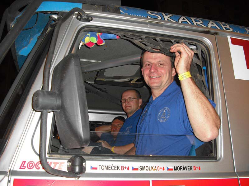 Po vyzvednutí vozů z uzavřeného parkoviště jsme absolvovali ca 7 km k rampě. U ní probíhal od pěti hodin odpoledne program představení posádek. Cestou k pódiu jsme několikrát museli zastavit, davy fanoušků se fotily u Tatry, bouchaly do dveří, tleskaly, nestačili jsme si s nimi podávat ruce. Klakson naší tatrovky snad tak dlouhou dobu ještě netroubil, každé zatroubení znamenalo odezvu od lidí – pískali, tleskali, doslova ječeli.
