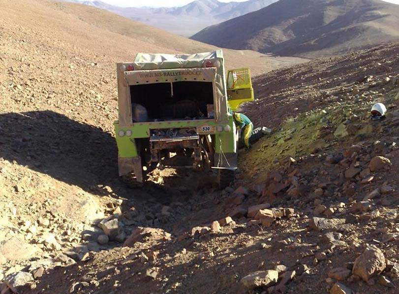 S vypětím sil se nám podařilo 9. etapu úspěšně absolvovat. Ale největší smůla na nás teprve čekala v 10. etapě v poušti Atacama. V první třetině jsme se doslova prodrali přes 12 kamiónů. Ale v postupu nás zastavila prasklá trubka vzduchu. Poté následovala smršť dalších problémů. Po defektu prasklé pneumatiky ve skalních serpentinách sjelo auto do hluboké kamenité rokle. Ale při vší smůle bez úhony nedobrovolný výlet přežilo! Po výměně pneumatiky ve skalní rozsedlině jsme pokračovali, abychom do konce etapy mohli opravovat ještě další dva defekty a dva kilometry před cílem navíc přidřený reduktor přední nápravy.