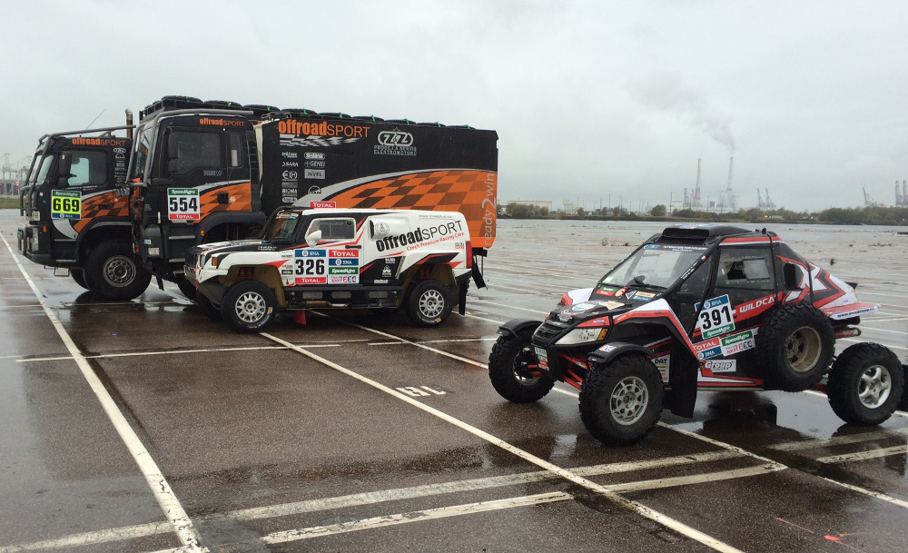 Obrovská loď Grande Sao Paulo se na 21 dní promění v největší plovoucí parkoviště závodních strojů a míří s drahocenným nákladem napříč Atlantikem. Se svými piloty se závodní vozy potkají až na začátku ledna v Buenos Aires. „Doufám, že až se s Lízou v Jižní Americe shledáme, bude v dobré kondici. Loni nám dorazila s rozbitou spojkou, ztracenými klíčky a vysazeným oknem, takže jsme se do oprav kamionu museli pustit ještě dřív, než závod vůbec začal,“ říká Martin Macík.