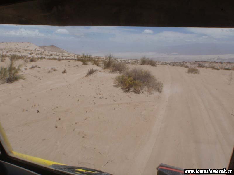 V dnešní etapě prakticky nebylo žádné místo k oddechu (nepočítám-li dva krátké přejezdy po zpevněné cestě). Po bahnu přišlo vyschlé řečiště plné meandrů, takže André div nestačil točit volantem. A pak přišly na řadu duny. Ještě než jsme se k nim dostali, museli jsme vyšplhat na takovou pískovou horu – takovou sjezdovku. Tahle však měla tak dva kilometry. Rvali jsme to nahoru na uzávěrku zadního i předního diferenciálu a když už jsme víc hrabali než jeli, vypnul jsem Andrému „předek“, aby mohl zatáčet a vytraverzovali jsme zbytek.