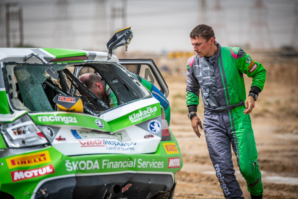 Bohužel snaha o udržení kontaktu s Katařanem a ztráta orientace posádky v rovinatém nepřehledném terénu čtvrté zkoušky byly příčinou havárie, v jejímž důsledku došlo k vážnému poškození vozu ŠKODA Fabia R5, a to na jeho mechanických částech i karosérii. I přes tuto nepřízeň osudu dokázali mechanici dostat za 30 minut v servisu vůz do stavu umožňujícím pokračovat v soutěži. Poškození vozu však bylo rozsáhlejší, než se v polední servisní přestávce zdálo a posádka musela nakonec odstoupit kvůli poškození horního uložení pravého předního tlumiče.