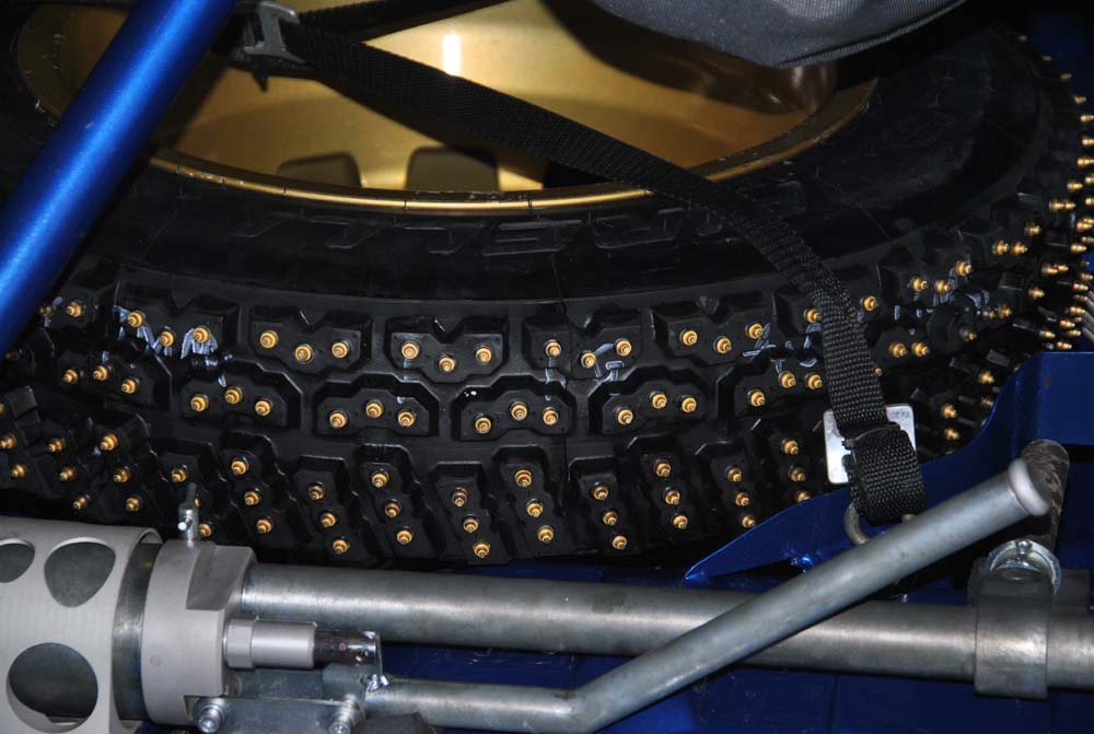 Samostatnou kapitolou jsou speciální pneumatiky, které jsou v odlišném provedení pro levou a pravou stranu auta, a každá je opatřena 380 hroty vystupujícími 7 mm nad běhoun. Hrotované pneumatiky, tentokrát v sériové verzi Nokian Hakkapeliitta 7, pak bude posádka používat už při seznamovacích jízdách. Hroty se do ledu doslova zakousnou a jízda tak pro našince téměř popírá fyzikální zákony – pro jezdce i diváky je to skvělý zážitek.
