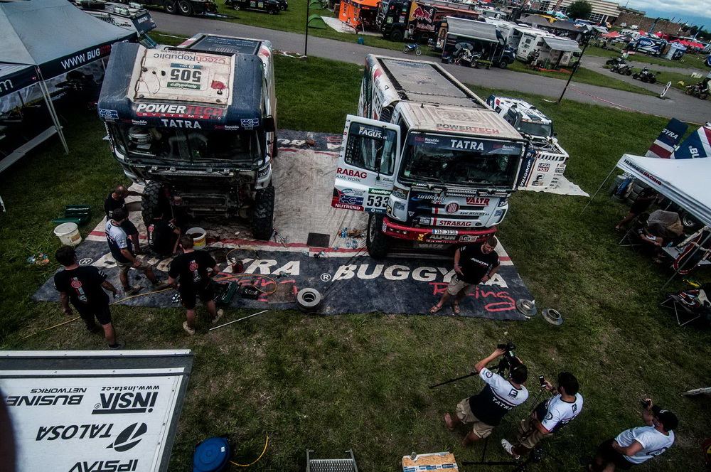 Slavná soutěž Rallye Dakar má za sebou den volna a přehoupla se tak do své druhé poloviny. Zatímco jezdci mohou načerpat sílu a odpočinout si od dlouhých a náročných přejezdů, pro mechaniky to znamená celodenní práce na závodní technice. Nejen TATRA BUGGYRA RACING tým, ale také ostatní účastníci, měli začátek volného dne podstatně ztížený. Kvůli záplavám zůstaly doprovodné vozy uvězněné 300 kilometrů od bivaku v Saltě. „Celý tým se nám podařilo seskupit až kolem jedenácté dopoledne. A povedlo se to jen díky unikátnímu podvozku Tatra, který dokázal razit cestu rozbouřenou vodou jako první,“ konstatoval manažer týmu Jan Kalivoda.