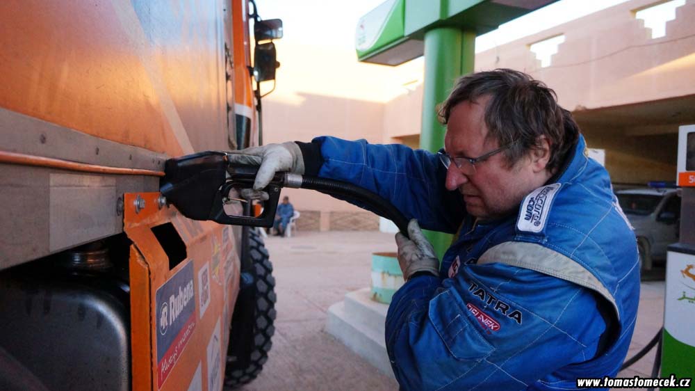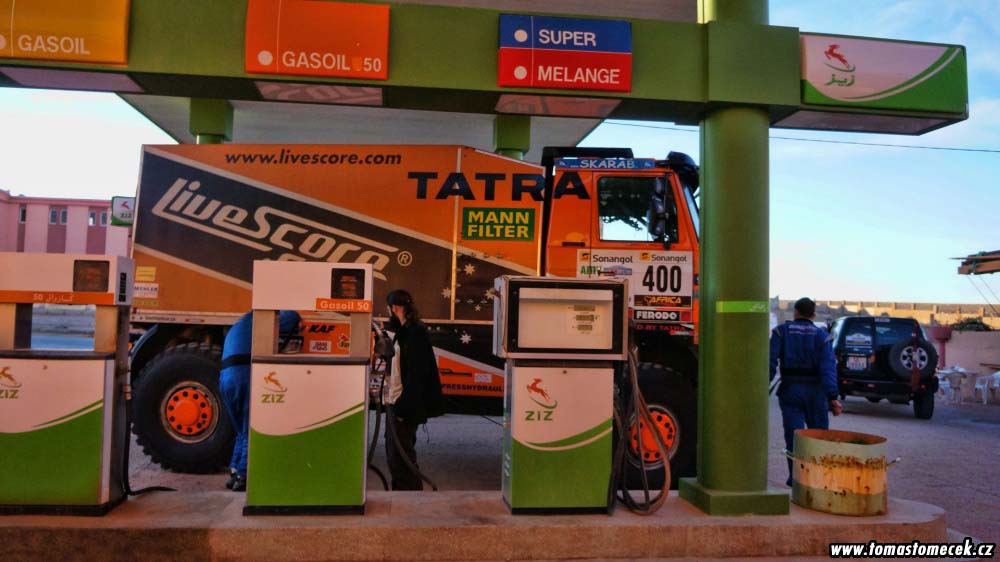 Několikrát mi byla položena otázka jak je to s čerpáním paliva na Africa Race. Zda si závodníci vozí vlastní palivo nebo spoléhají na místní zdroje. Začneme kategorií motorek. V dlouhých etapách mají motorkáři místa, kde mohou dotankovat své stroje a chvilku si odpočinout. Palivo jim zajišťují pořadatelé. Pokud je třeba tankovat mimo rychlostní zkoušku, tak lze využít vyznačených, a tím pořadateli doporučených, veřejných čerpacích stanic. V každém roadbooku je jich několik. Závodníci v kategorii kamiónů se dělí na dvě skupiny. Jedna z nich využívá veřejnou síť, druhá si v asistenčních kamionech vozí speciální vysokooktanové palivo na celou soutěž sebou. V kategorii kamionů, co vím, si nikdo ze závodníků nevozí naftu sebou, ale čerpá se na běžných místech.