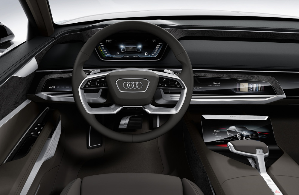 Řidič má ve svém zorném poli digitální panel přístrojů Audi virtual cockpit future. Displeje s vysokým rozlišením a tři zrcadla vytvářejí virtuální vizuální „pódium“ se třemi úrovněmi.