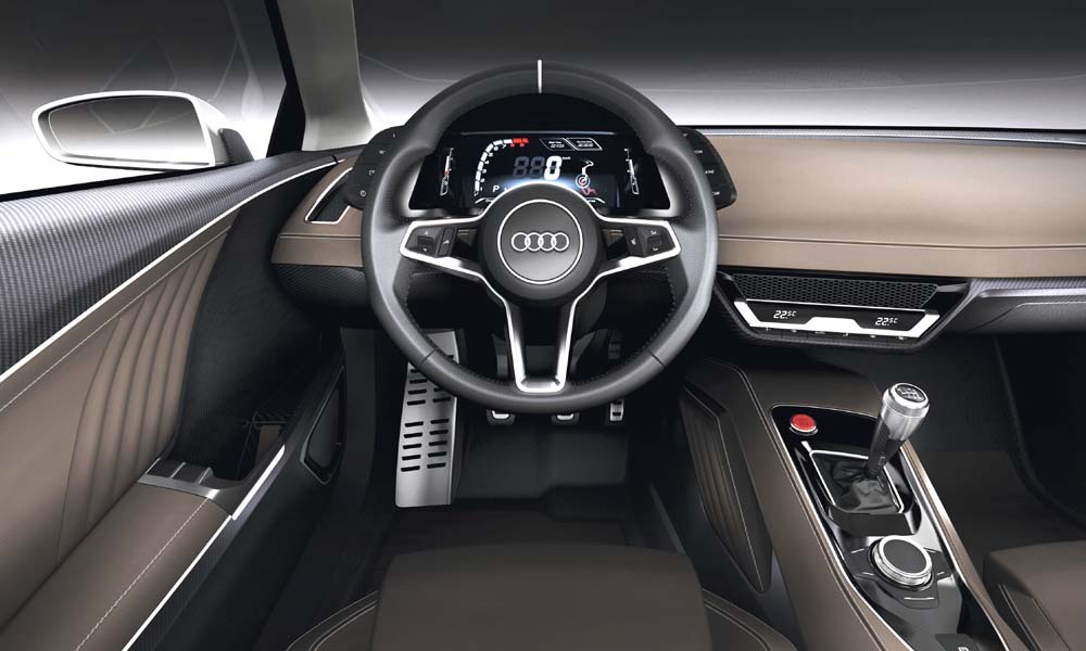 Sportovní atmosféru vytváří kombinace kvalitní kůže a uhlíkového kompozitu. Ovládání usnadňuje systém MMI touch, řadicí páka šestistupňové mechanické převodovky je umístěna na štíhlé středové konzole. Přístrojová deska je digitální. V závodním režimu připomíná grafika displeje digitální přístroje modelu quattro z 80. let. Stejný zdroj inspirace prozrazují čtyři plochá tlačítka po obou stranách přístrojového panelu.
