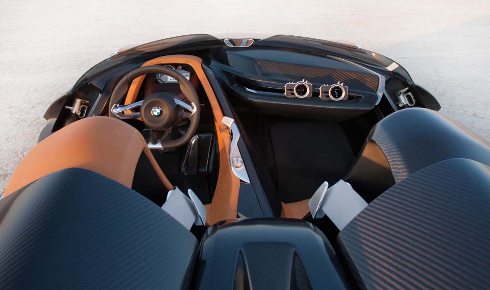 V interiéru je použito mnoho prvků z historie závodních BMW 328. Příkladem je třeba mírně asymetricky řešené čelní sklo se sníženou střední částí. Dalším odkazem na minulost je čtveřice kožených pásků, vedených přes kapotu motoru a pokračujících na bocích. Tyto pásky dokonale vyniknou díky lesklým hliníkovým zámkům, jež vytvářející potřebný kontrast mezi minulostí a současností.