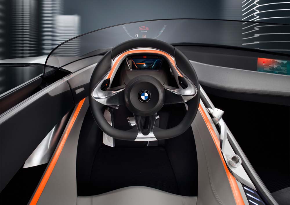 Koncept BMW Vision ConnectedDrive byl vložen do otevřené karoserie sportovního dvoumístného roadsteru, protože právě tak je při pohledu shora vidět celé řešení interiéru.