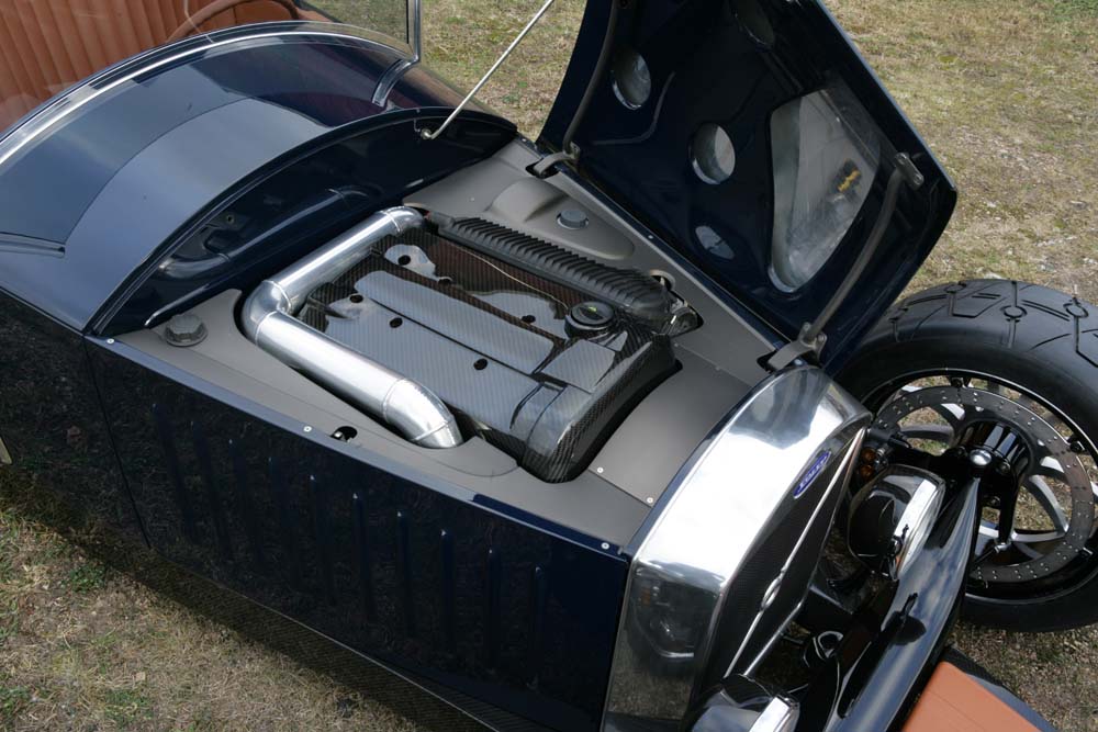 V interiéru zaujmou hluboká tvarovaná opěradla, která nahradila jednoduchou rovnou lavici, a vytvářejí robustní a sportovní atmosféru. Originál připomínají lemy švů a svislé drážky na opěradle, zatímco perforovaná plochá horní část za sedadly odráží modernější stylistický přístup. Pohled na přístrojový panel prozradí absenci konvenčních analogových ukazatelů, místo nich jsou všechny funkce sloučeny v jediném přístroji, vpravo od volantu. Stiskem tlačítka se mění jeho barva a funkce. Po prvním stisknutí se zapne zapalování a tlačítko změní barvu na červenou. Sešlápněte spojku a tlačítko je fialové. Dalším stisknutím dojde k nastartování motoru a současně se barva tlačítka změní na modrou.