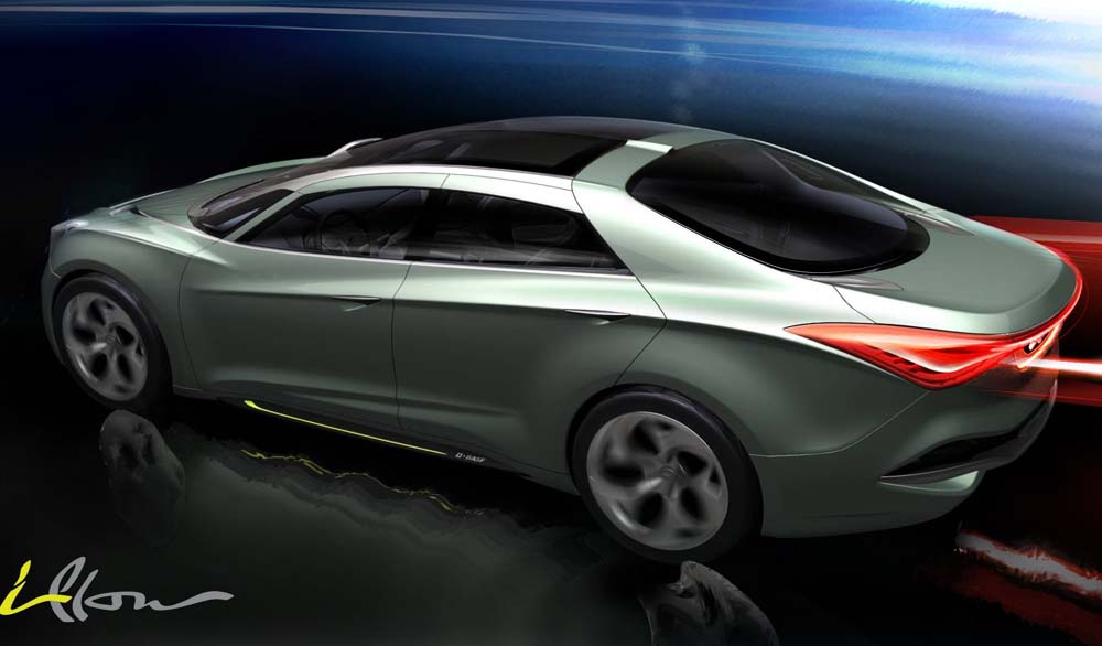Ve světové premiéře odhalí 2. března na autosalonu v Ženevě firma Hyundai novou koncepční studii, která odkrývá roušku nad designem připravovaného sedanu pro segment D. Na přiloženém snímku je první letmý nástin vzhledu konceptu nazvaného i-flow.