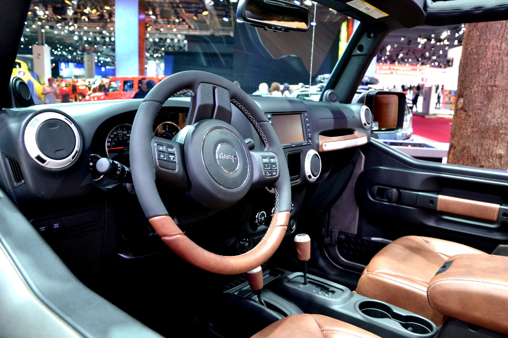 Jeho vzhled je skutečně nepřehlédnutelný. Zmínku zaslouží upravená kapota s výdechy od motoru, černé otvory mřížky chladiče a zcela nová světelná rampa s technologií LED. Tradiční nárazníky nahradily offroadové v designu Rubicon X. Styl doplňují nové blatníky, poloviční dveře, ochrana proti poškozením, a na první pohled je zřejmá i zvýšená světlá výška a 37“ pneumatiky na 17“ ráfcích. Stylistické prvky vznikly ve spolupráci značek Jeep, Mopar a stylistického centra skupiny Fiat Chrysler Automobiles a výstavní model činí doslova unikátním. Karoserie je vyvedena v texturovaném laku Iron Peltrox, interiér pak v koženém čalounění s historickým nádechem.