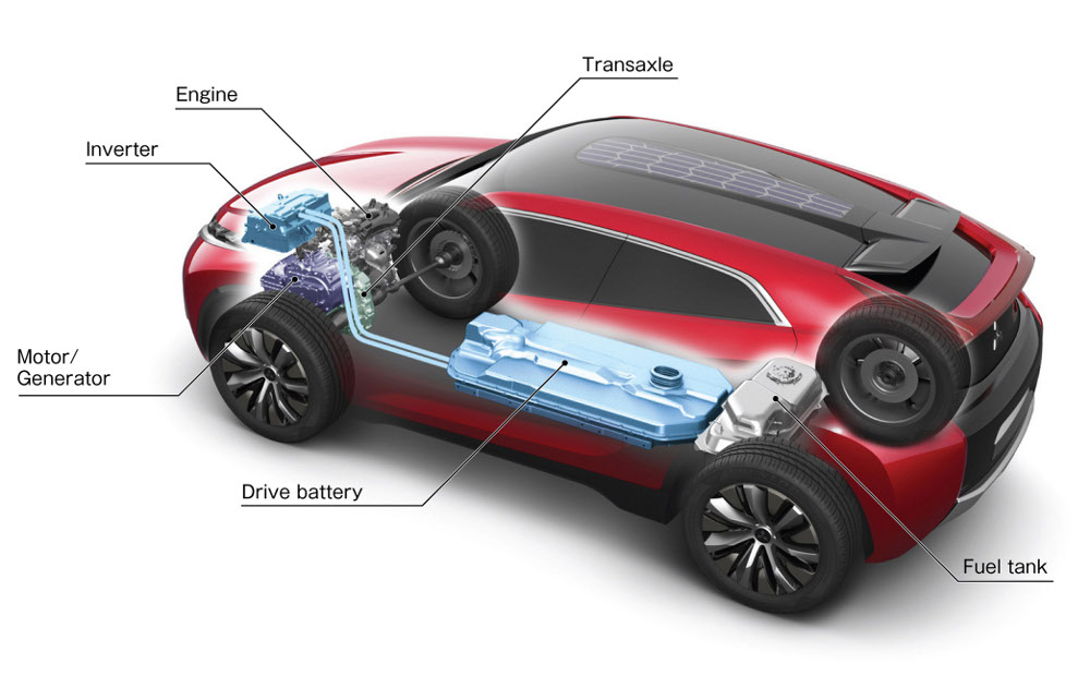 o objemu 1,1 litru s přímým vstřikováním a variabilním časováním sacích ventilů MIVEC; dále vpředu jeden (namísto dvou jako v Outlanderu PHEV) lehký, kompaktní a účinný elektromotor s pomocným měničem; a konečně vysokokapacitní baterii pod podlahou vozu. Měnič slouží ke zvýšení výkonu